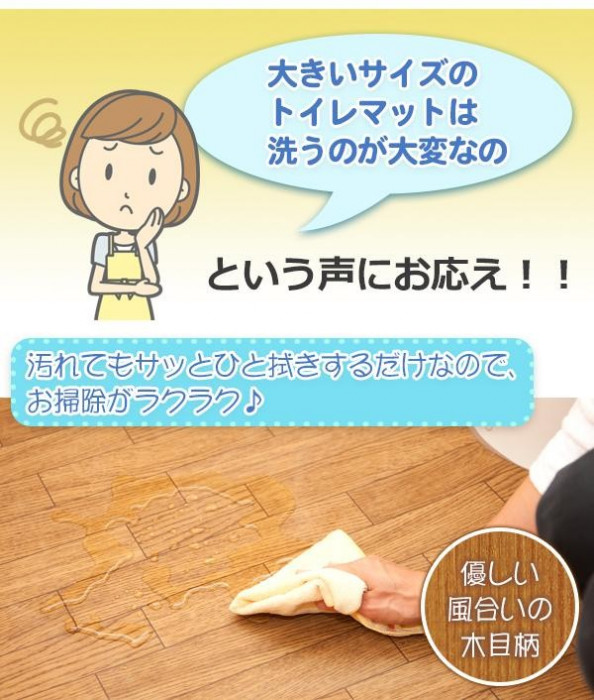 | 「大きいサイズのトイレマットは洗うのが大変!」という声にお応えして、さっとひと拭きするだけで簡単にお掃除できるトイレマットが誕生しました。使わない時はくるくる巻いてコンパクトに収納できます。手前も奥もしっかりカバーできるレギュラーサイズ!優しい風合いの木目柄です。 |