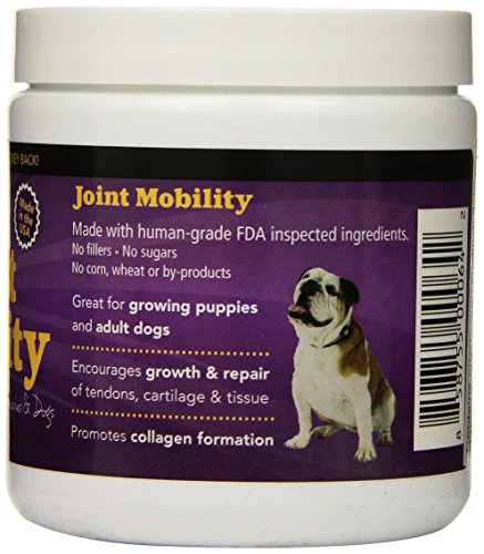 -. LegalDisclaimer : All-natural joint support for dogs. Relieves stiff & sore joints, encourages growth and repair of tendons, cartilage and tissue and promotes collagen formation.Available In: 8oz & 1 lb. containers