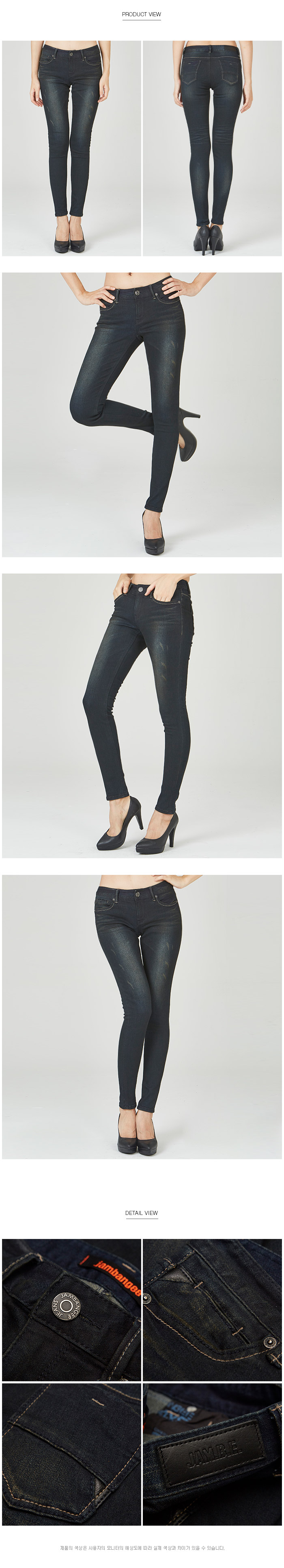 블랙 안료 워싱으로 다크한 인디고 칼라에 부분 블랙 레쟈로 디자인 포인트를 준 엠보 워싱 SN 핏 데님 스타일.