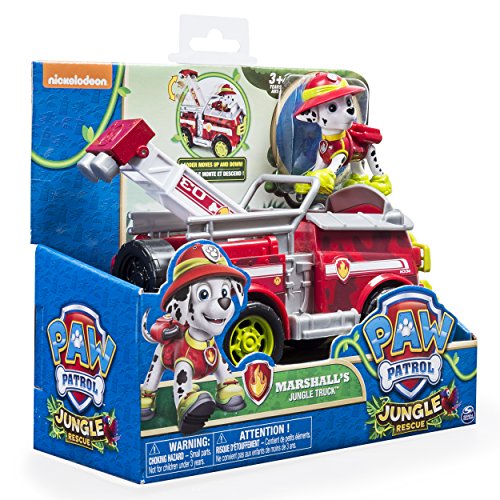 No job is too big and no pup is too small! Now you can re-enact new jungle-themed rescue missions with Marshall and his jungle truck! Race to the ruff-ruff rescue with Marshall and his real working ladder! Together, your child’s imagination will be lit up with pup inspired rescue missions full of friendship, teamwork and bravery. With Marshall and his Jungle Truck you can save the day! Recreate your favorite Paw Patrol adventures with the Paw Patrol Jungle Rescue vehicles and figures!Feature