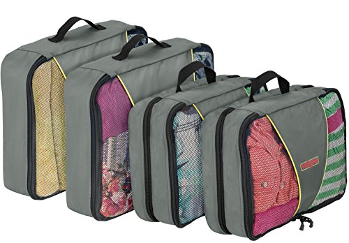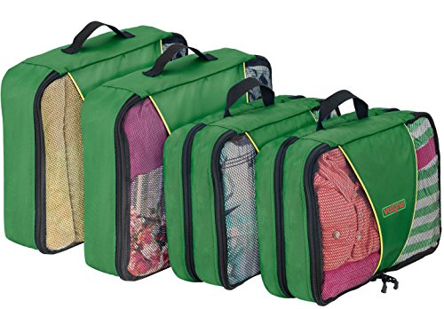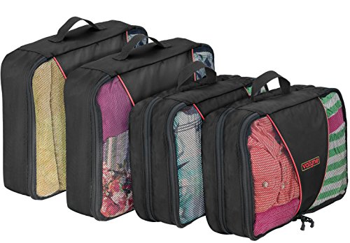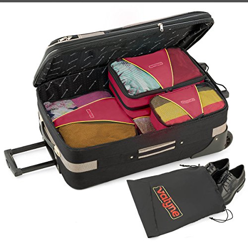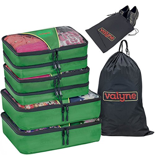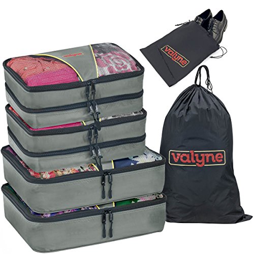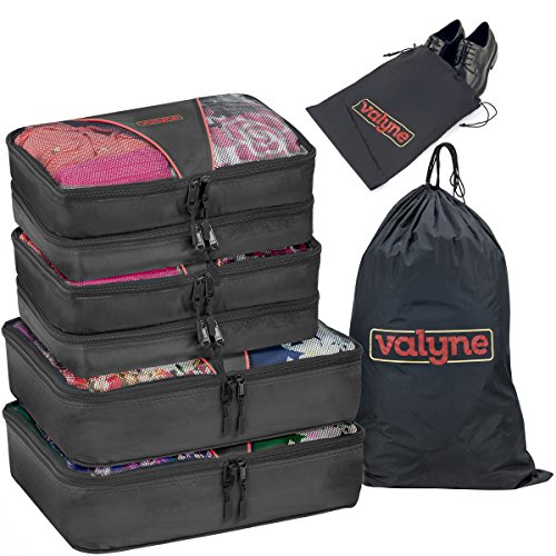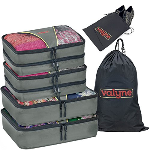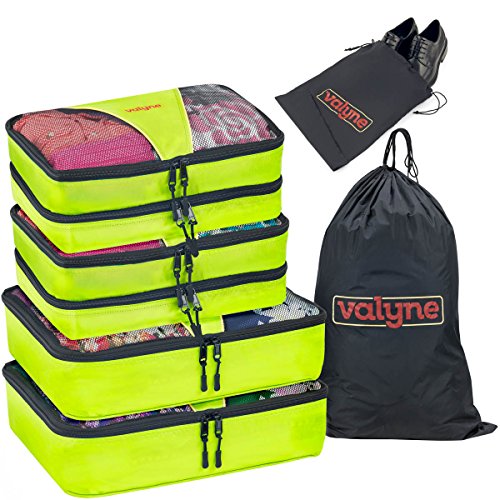 Product Description Packing for a trip : Vacation time sounds exciting? But getting your stuff together and fitting it neatly in to your luggage is one of the toughest things to do.So here you go with the solution.. Valyne packing cube is specially designed to keep your stuff neat,tight,and wrinkle free so you arrive perfect just the same you placed it. When you arrive to your hotel room there's no need to unpack your stuff simply place the cube organizers on the shelf and enjoy your stay When leaving zip the cubes and you're ready to leave,no need to look for leftover stuff.what a breeze! Enjoy it in the comfort of your home : Organize Cosmetics,baby clothing,or electronics,Our Packing Cubes are the perfect organizing solution. Quality and durability:We worked,researched and planned together from our quality experts, to our product designers,as one team. To design the most durable and high quality water resistant nylon packing cube. We used 2 way YKK zippers,with pull cord to guarantee you with a smooth and easy opening and closing. Our mesh is strong and double stitched,interior seams fully finished for durability. Varity of colors :Locate your items easily, We manufactured a great verity of colors to suit everyone's taste and to make packing easy and exciting! Choose a color for each category for example cosmetic in one color outdoor stuff, rain hat,umbrella,and gloves in a different color etc. You'll locate everything in a split second. Just try it, works magic! Bonus : laundry bag and shoe bag included Dimensions Large: 15.5" x 12.75" x 4" Medium: 13.75" x 9.75" x 5 "(double compartment each 2½ inches deep) Laundry bag 20"X14" shoe bag 0