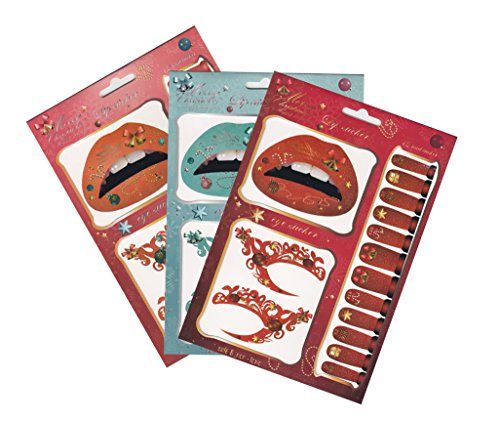 -. Feature : Package include: 3-pack Assorted color Party Eyeshadow Lip Nail Sticker Temporary Tattoo Kit. Each Pack Includes: 3 lip tattoo sticker, 2 eyeshadow tattoo stickers, 10 nail tattoo stickers and 1 nail smoothing tool / Sheet Size: 8.25 x 5.8 inches wide and tall (21cm x 14.5cm). Color May Vary / lip sticker size: app 8x5.3cm eyeshadow sticker size: app 7.5x3.6cm nail sticker size:max 3.5x1.5cm min 3.3x1cm / Precut tattoos dab on with water in seconds, brush with your skin-toned face powder to set. Removes with baby oil. / Great Christmas gift. Color May Vary.