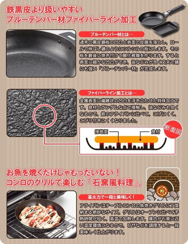 | 鉄の良さを引き出す着脱ハンドル式。耐熱温度の高い鉄製だから焼き物料理に最適。ガス・IHなどのコンロで使うだけでなく、ハンドルが外せるのでオーブンやコンロのグリルにも使えて調理の幅が広がります。「ちょっと美味しく仕上げてみたい!!」そんなこだわり派さんにおすすめです。 |