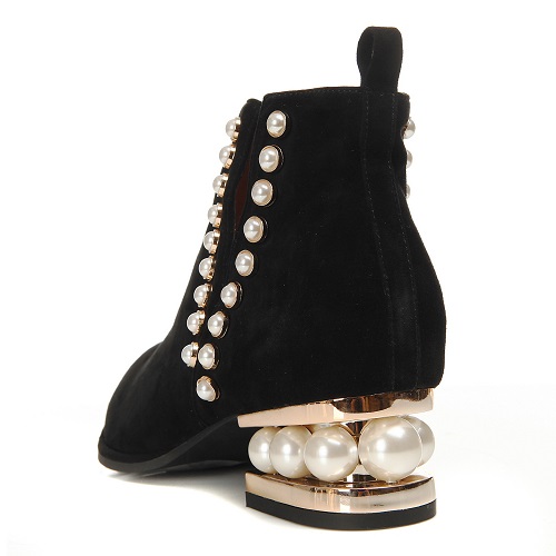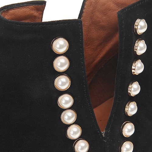 특히 뒷굽의 매력적인 포인트로 메탈과 진주장식을 사용하여 옆라인, 뒷라인이 더욱더 멋스러움을 강조.