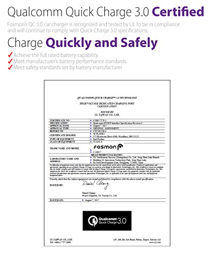 -. Feature : [DUAL USB AND QUICK CHARGE 3.0] Charge two USB devices at the same time with Fosmon's 30W 2-port USB Car Charger. With one built-in Quick Charge 3.0 USB port, your compatible devices will charge faster in a shorter time. / [SAFE CHARGING] Fosmon's 2-Port USB Car Charger comes with a triple safety feature. The 2-Port USB Car Charger has built-in over-current, over-voltage, and short-circuit protection. / [UNIVERSAL COMPATIBILITY] This 2-Port USB Car Charger is compatible with all USB powered devices including Quick Charge 1.0, 2.0 and 3.0, as well as non-quick-charge devices. / [LIMITED LIFETIME WARRANTY] Includes a Limited Lifetime Warranty