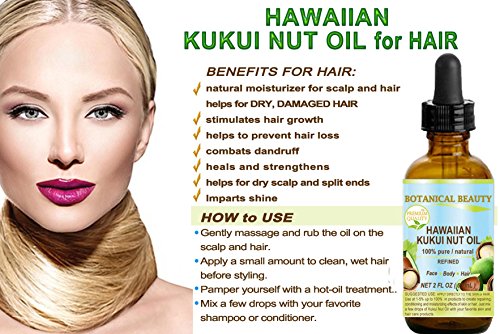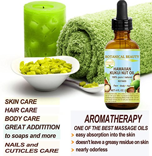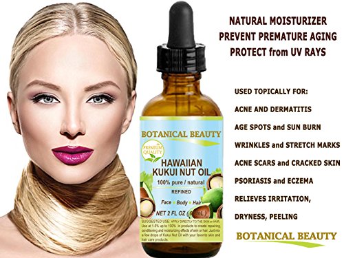 -. Feature : Rich in vitamins E, A, D, B1, B2 and B6, oleic and linoleic acids, proteins, potassium and zinc, ideal light moisturizer for everyday use. 100 % Pure / Hawaiian. A Little Goes a Long Way, Absorbs Quickly, Not Greasy, Unscented, Chemical Free, Not tested on Animals, DOES NOT CONTAIN ANY PRESERVATIVES. / KUKUI NUT OIL HAWAIIAN is a great emollient for the SKIN AND HAIR. / KUKUI NUT OIL HAWAIIAN is well suited FOR ECZEMA, PSORIASIS AND ITCHY, DRY AND INFLAMED SKIN. / KUKUI NUT OIL HAWAIIAN is very beneficial for PLUMPING AND FIRMING THE SKIN. Suitable for all skin types. It is a great aromatherapy oil, massage oil or after bath oil. / KUKUI NUT OIL HAWAIIAN is great for STRETCH MARKS. This is as a result of its emollient quality that tightens the skin.