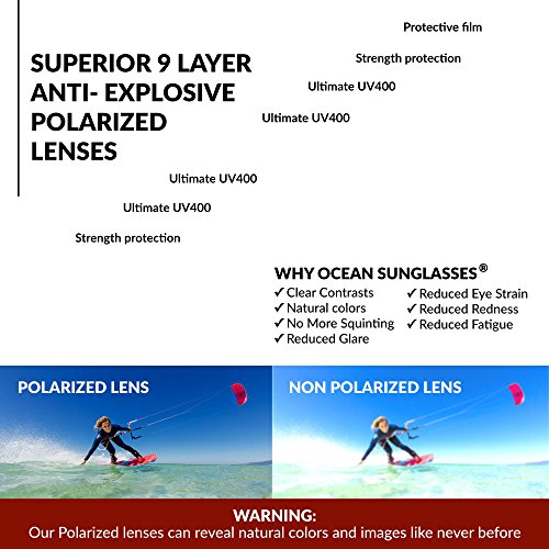 Product Description PERFORM BETTER, LONGER AND HARDER Whether you surf, paddle, sail or fish, protect your eyes from the sun's glare, wind and ocean spray with Ocean Sunglasses. High performance eyewear designed for water and high wind sports including surfing, kitesurfing, windsurfing, sailing, SUP and fishing and more. MEET YOUR NEW FAVORITE SUNGLASSES BRAND Ocean Sunglasses is fast becoming the go-to independent brand for innovative sunglasses that won't cost a small fortune. We're obsessed with great design and high quality construction that offers exceptional value for money. Ocean Sunglasses is based on the cosmopolitan Basque Coast of Northern Spain. Sandwiched between the Atlantic Ocean and the Pyrenees Mountains, it's a mecca for adventure sports lovers and one of the top surf and ski destinations in Europe. We create everyday eyewear that is functional, stylish and durable. Our high performance sports sunglasses are virtually indestructible; designed to withstand the demands of the surf and the mountain. Our range of stylish, urban sunglasses perfectly captures our beach to bar vibe. We're so confident you'll become a raving fan that we ball all Ocean Sunglasses with a 30 Day No Hassle Money Back Guarantee. Insist on the best - without breaking the bank. Add your Ocean Sunglasses to cart now and feel the excitement of your next Amazon delivery! 0