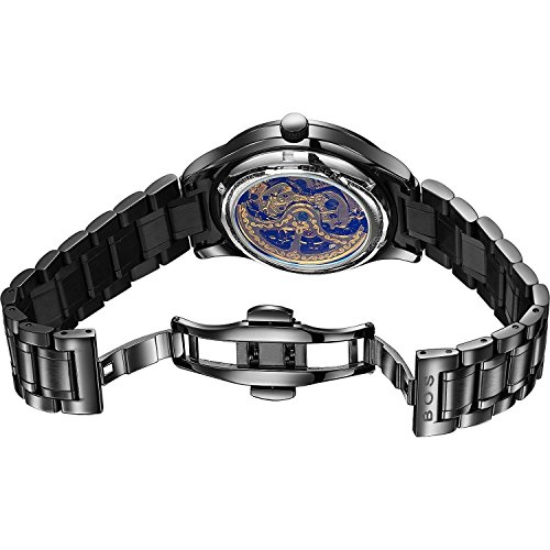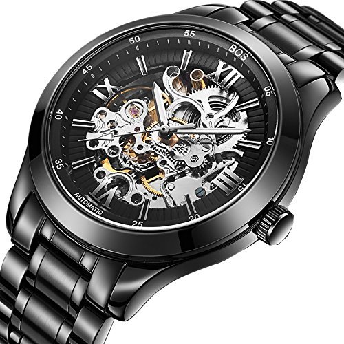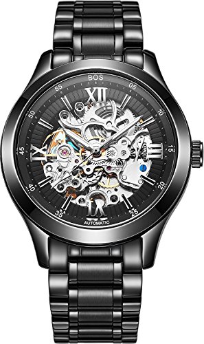 -. Title : BOS Men's Automatic self-wind mechanical Pointer Skeleton Watch Black Dial Stainless Steel Band 9008