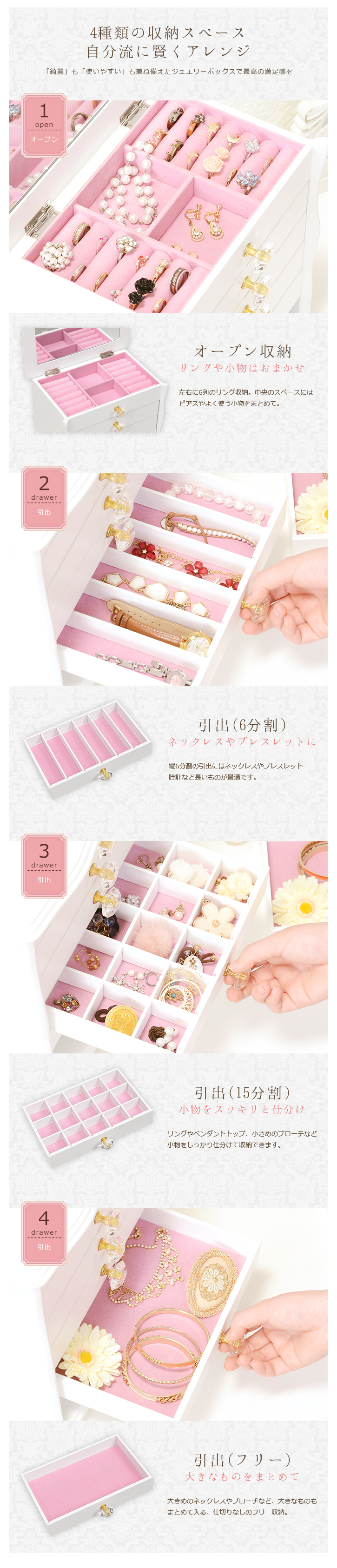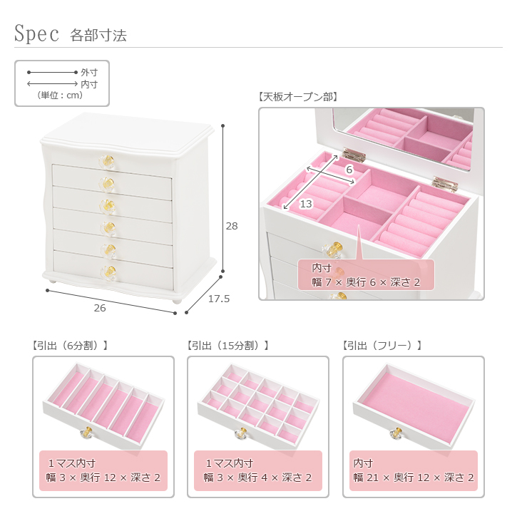 ■ 引出内寸:(約)幅21×奥行12×深さ2cm■ 1マスサイズ(天板オープン部 フリースペース):(約)幅7×奥行6×深さ2cm■ 1マスサイズ(引出 6分割):(約)幅3×奥行12×深さ2cm■ 1マスサイズ(引出 15分割):(約)幅3×奥行4×深さ2cm■ 1マスサイズ(引出 フリー):(約)幅21×奥行12×深さ2cm