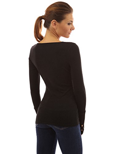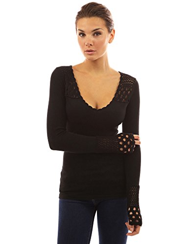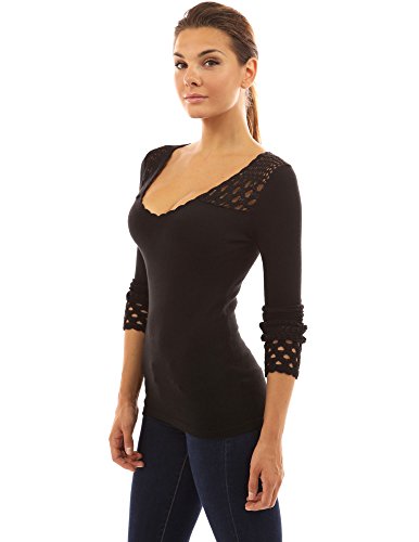 PattyBoutik Crochet Eyelet Lace Inset V Neck Long Sleeve Ribbed Knit Top. Model in pictures is 5 feet 8 inches (173cm) tall wearing size S.