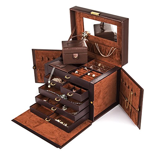 -. Binding : Kitchen -. Brand : Kendal -. EAN : 0783583120180 -. Feature : 5 slide out drawers; 20 compartments;10 necklace hooks;3 large storage pouches;Lined in silsuede and finished in oiled leather and durable synthahide. / 2 removable earring holders which hold up to 30 earrings (10 hanging, 20 posts) / Twin fold out side compartments with snap closures. Great for hanging necklaces, bracelets, and other. / Large mirror on top lid;removable mini travel jewelry box (shown at rear left of the jewelry box) that holds even more rings/necklaces/earrings and other jewelry.. perfect for any trip! Locked with a key. / Measures 10.25inch x 7.5inch x 8.75inch when closed. -. Label : Shining Image -. Manufacturer : Shining Image -. MPN : Brown-box-FBA -. PackageQuantity : 1 -. PartNumber : Brown-box-FBA -. ProductGroup : Home -. ProductTypeName : HOME -. Publisher : Shining Image -. Studio : Shining Image -. Title : Shining Image Brown LEATHER JEWELRY BOX / CASE / STORAGE / ORGANIZER WITH TRAVEL CASE AND LOCK -. UPC : 783583120180