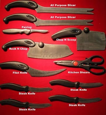 The Miracle Blade III 11-pc. Knife Set is a multi-purpose collection of ultra durable kitchen tools. Crafted with revolutionary comfort handles and a unique 3-in-1 blade edge. These durable knives make quick work for meal preparation. The assortment includes 4 steak/utility knives, 1 filet knife, 1 perfection paring knife, 1 perfection kitchen shears, 1 chop n scoop cleaver, 1 rock n chop cleaver, and 1 miracle blade slicer. Great as a registry, birthday, or anniversary gift!