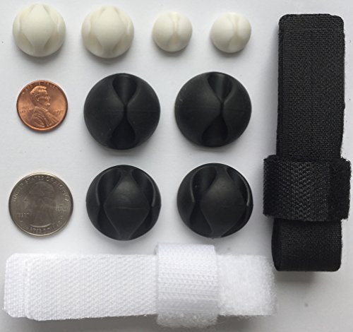 {} Best solution on the market to secure and organize your fallen and unruly cables. 8 clips and 10 velcro in white and black to tidy up those long messy cords that are an eye sore and in the way of pets/children and vacuuming.