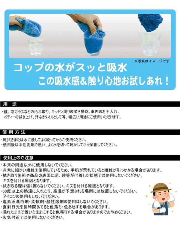 吸水力抜群で汚れも落ちやすいタオルです。鏡や窓ガラスの汚れ取りやキッチンのふきん、車のお手入れなど幅広い用途に使用できます。ふわふわのさわり心地なのでハンカチや汗ふきタオルとしても。 |