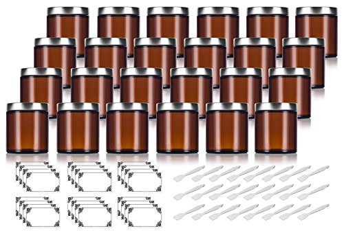 - Includes 24 - 4 oz / 120 ml Amber Glass Straight Sided Jars with Metal Foam Lined Lids + Spatulas and Labels