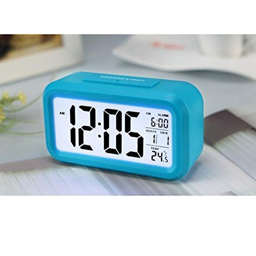 Coolbuy112 Digital LCD Alarm Clock w/ Date and Temperature Display, Repeating Snooze, Light-activated Sensor Light, Multifunction Alarm Clock (Blue)