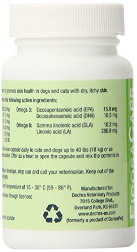 -. Binding : Misc. -. Brand : Dechra -. EAN : 0813471013963 -. Feature : Nutritional Fatty Acid supplement for use in cats and dogs weighing less than 40 pounds / Promotes healthy skin in dogs and cats with dry, itchy skin / Easy to use - Offer as a treat, or sP.R.Inkle over food! / Made in the USA -. Label : Dechra -. Manufacturer : Dechra -. Model : DP-0-40 -. MPN : DP-0-40 -. PackageQuantity : 1 -. PartNumber : DP-0-40 -. ProductGroup : Pet Products -. ProductTypeName : PET_SUPPLIES -. Publisher : Dechra -. Studio : Dechra -. Title : Dechra 60 Capsules EicosaCaps Fish Oil Nutritional Supplements for Dogs and Cats Up to 40-Pound -. UPC : 813471013963