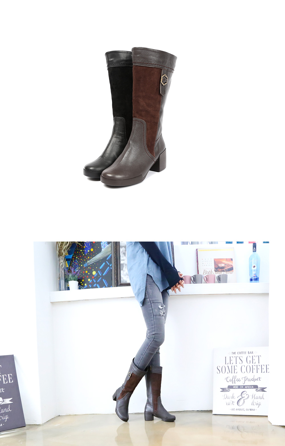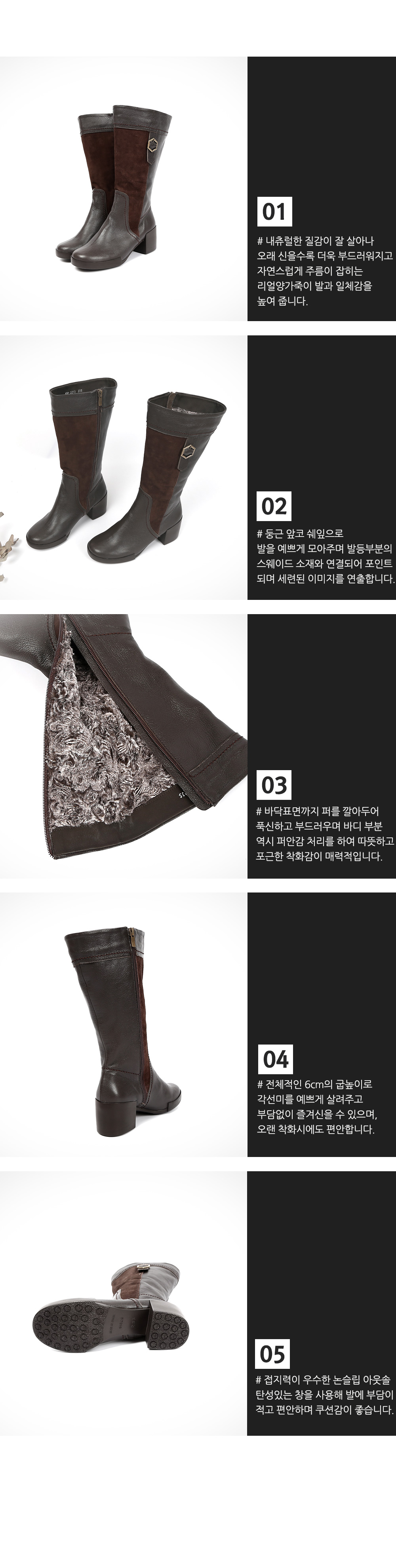 리얼 양가죽과 스웨이드의 콤비가 매력적인 벤나 콤비 미들 퍼 부츠 입니다 미들 부츠 아이템중에 1순위로 추천드릴 수 있을 정도의 퀄리티와 디자인적인면에서 압도적인 인기를 얻고 있는 제품입니다. 보온성을 높이면 스타일이 조금 씩 이상해지기 마련이지만 디자인적인 면도 꼼꼼한 신경을 써서 다양한 연령층에게 구매도가 고르게 분포된 제품입니다. 안감전체에 풍성한 퍼로 제작되어 한겨울 내내 따뜻하게 신을수 있습니다 바닥창(안감바닥)은 기모로 한번 깔아주었으며 뒷축안감은 고급내피를 한번떠 깔아 주어 미끄럽지 않게 착용하실수 있습니다