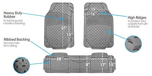 -. Brand : FH Group -. Color : F11307 Gray -. Feature : FH Group is a registered brand. For quality goods please ensure you are purchasing from FH Group only, do not fall for imposters. We cannot guarantee merchandise from other sellers to be as pictured and uphold the same quality. / Material: heavy duty vinyl. / Intelligent design combined with trim lines allow for flexible customizations, trimmable with ordinary scissors. Rear piece can be trimmed into 2 separate pieces or kept as one long piece. / Offers all-season protection. Heavy ridged underside prevents shifting and help keep mats securely in place. Durable and heavy-duty vinyl with tall edges and interior channeled area prevent spills and messy cargo from leaking into your original factory mats. Semi customized to fit most sedans, trucks, and SUVs. / Package includes: 3 piece floor mat. Dimensions: Front: 27.5 x 17.8 inches Rear: 58.3 x 14.8 (middle width) x 17 inches -. IsAutographed : 0 -. IsMemorabilia : 0 -. Label : FH Group -. Manufacturer : FH Group -. ManufacturerPartsWarrantyDescription : Parts -. MPN : F11307GRAY-A -. PackageQuantity : 1 -. PartNumber : F11307GRAY-A -. ProductGroup : Automotive Parts and Accessories -. ProductTypeName : AUTO_ACCESSORY -. Publisher : FH Group -. Studio : FH Group -. Title : FH-F11307 Semi Custom Trimmable Heavy Duty Rubber Floor Mats Front & Rear - Gray 3pc Set