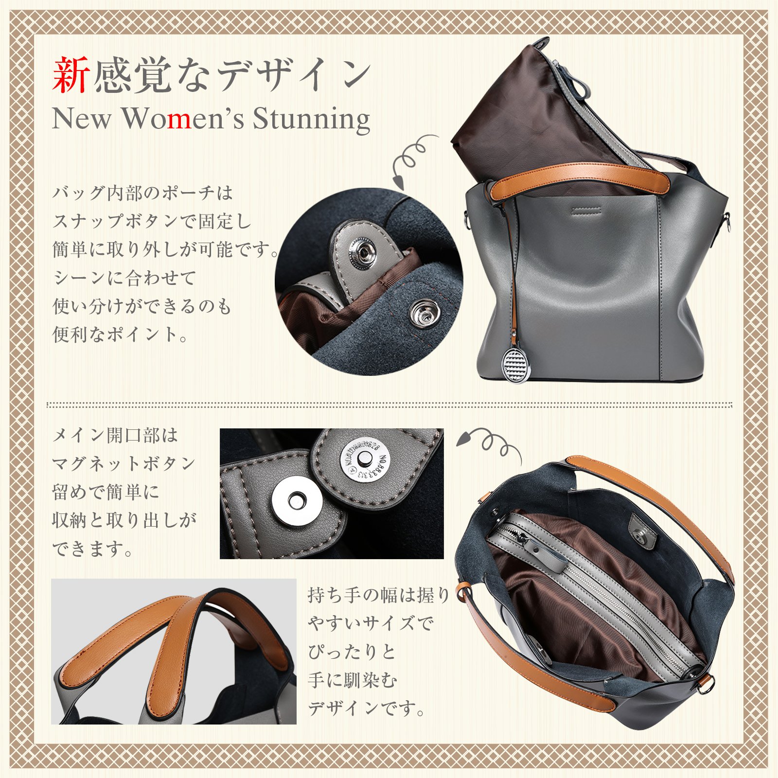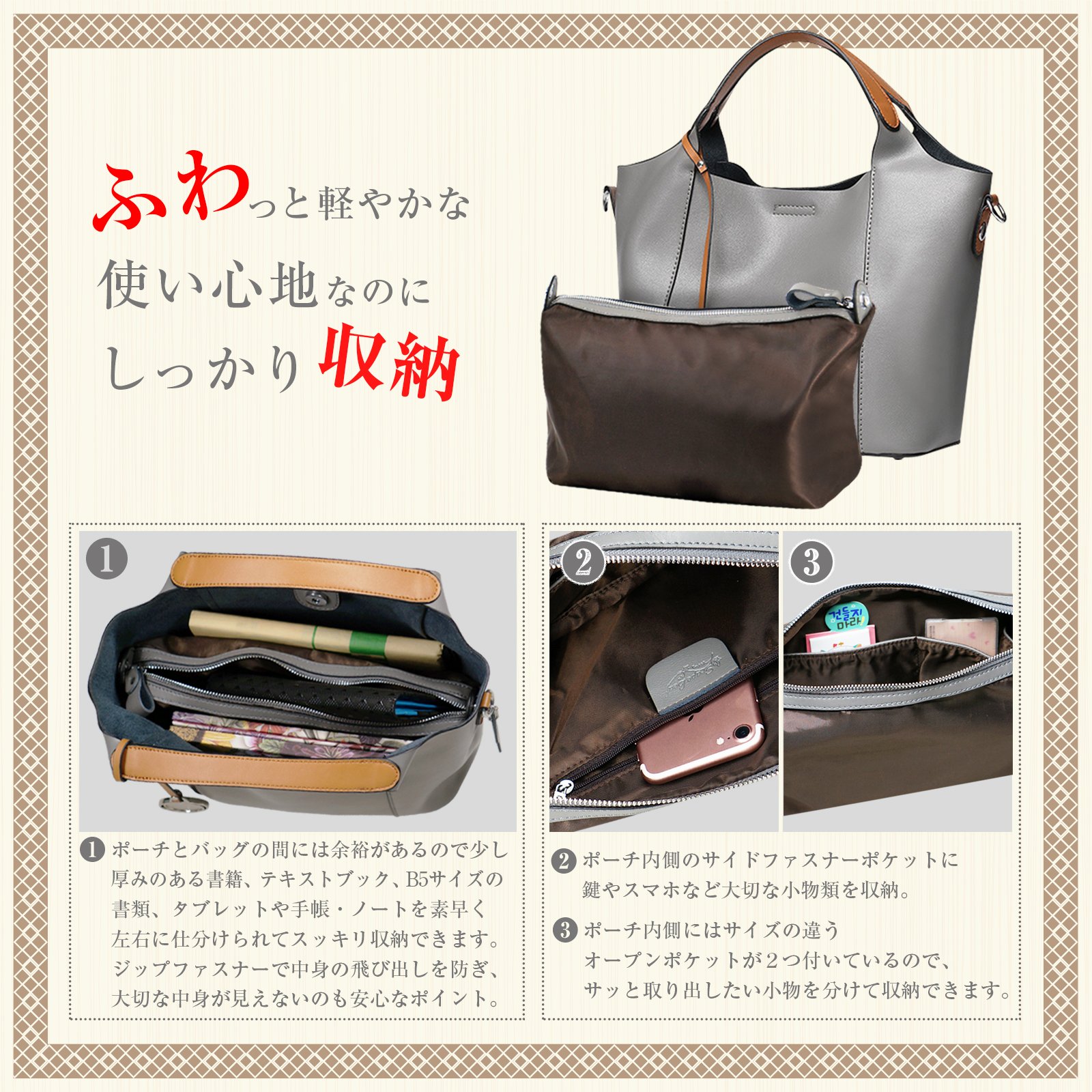 · Pouch inside the bag can be fixed with snap button and can be easily removed.