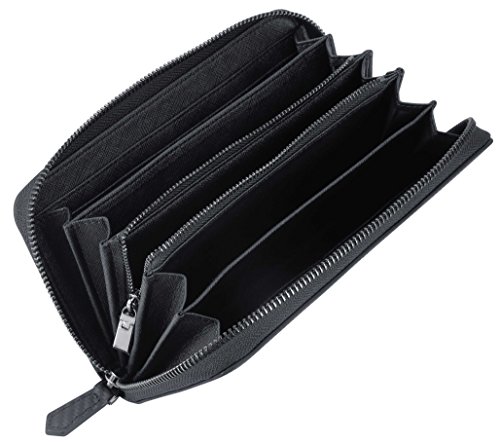 - A RFID Blocking Wallet: A layer of silver embroidered lining surrounds the entire wallet when the wallet is zipped, providing comprehensive protection to the vital information in your ID card, credit/debit card and driver license.