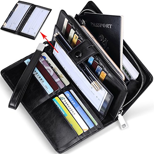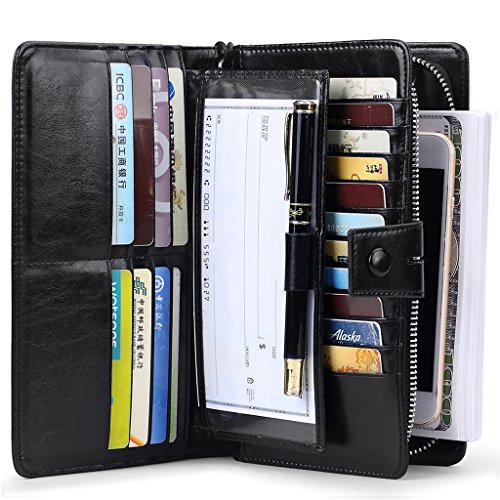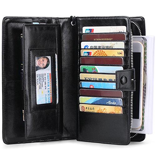 - Large Capacity - This is a multifunctional wallet with huge storage capacity, it features 19 credit card slots, 1 separate zippered area has another zippered pocket for change and two large compartments for storage cash, bills, passport and even cell phone (can fit iPhone X 7/8 plus), a removable checkbook cover with 1 ID window, 1 bill compartment and 1 pen holder (can used as a checkbook wallet)