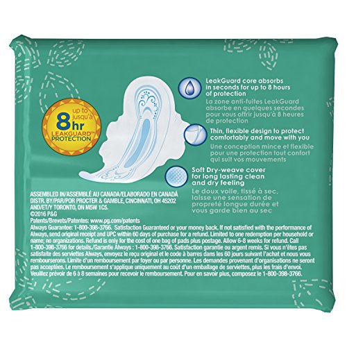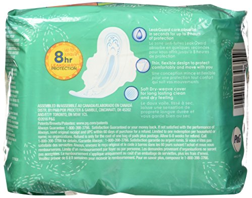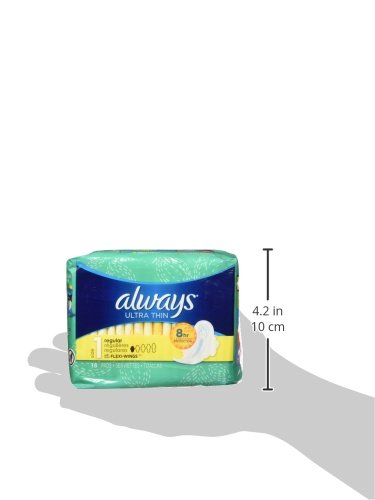 Product DescriptionAlways Ultra Thin pads with LEAKGUARD RapidDry ; Absorbs in Seconds ; Clean.Dry.Fresh. during the Day Up to 8 hour absorbency for your busiest days 3WayGrip flexi-wings help your pad stay put0