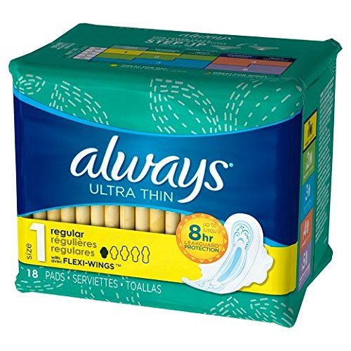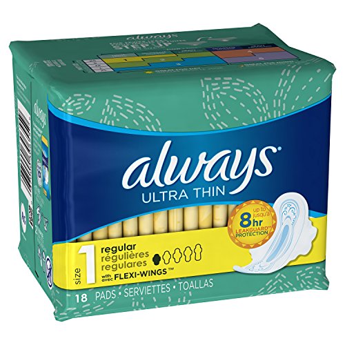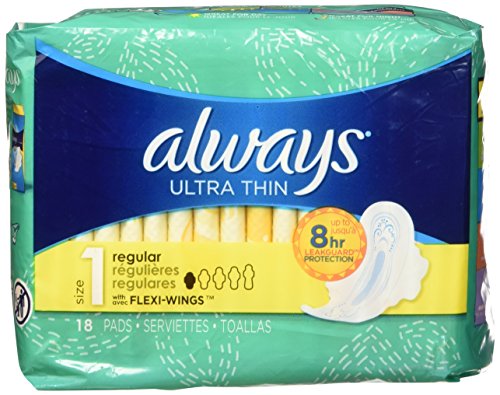 Always Ultra Thin Size 1 Pads With Wings, Regular Absorency, Unscented, 18 count (Packaging May...