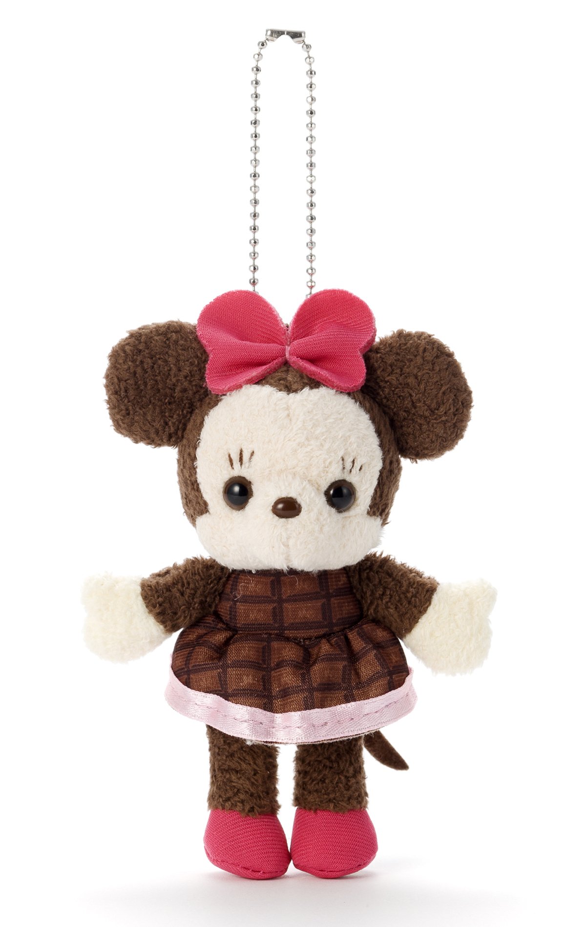 It is a mascot with a ball chain wearing a chocolate pattern dress.