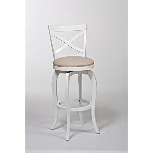 -. Feature : Contemporary cottage design featuring curving X back / Genuine hardwood and wood composites in white finish / Padded seat with beige fabric upholstery / Full 360-degree swivel seat ideal for open floor plans / Seat height: 32 inches