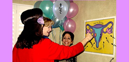 20" x 27" Poster of The Lucky Lady Egg sitting in her uterus. Comes with 48 glossy card stock sperm & removable sticky tabs. Played like the old Pin the Tail on the Donkey game & comes with a purple sleep mask/ blindfold (which can be used after the event by the mom or dad when they'll need that nap during the day). 72 Lavender raffle tickets, 1 Lucky Lady hand fan, 3 Lucky Lady Balloons, 3 Lucky the Sperm Balloons and 1 Balloon of Lucky the Sperm's face!