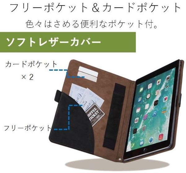 ●カバー内側にフリーポケット、ダブルカードポケット、ハンドホールドベルト、そして背面側にペンホルダーを備えた日常での使いやすさを向上させたブラックとブラウンのツートンカラーデザインのiPad mini 4用ソフトレザーカバー。