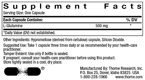 -. Binding : Health and Beauty -. Brand : Thorne Research -. Label : Thorne Research -. Manufacturer : Thorne Research -. ProductGroup : Health and Beauty -. ProductTypeName : HEALTH_PERSONAL_CARE -. Publisher : Thorne Research -. Studio : Thorne Research -. Title : Thorne Research - L-Glutamine (500mg) 90c