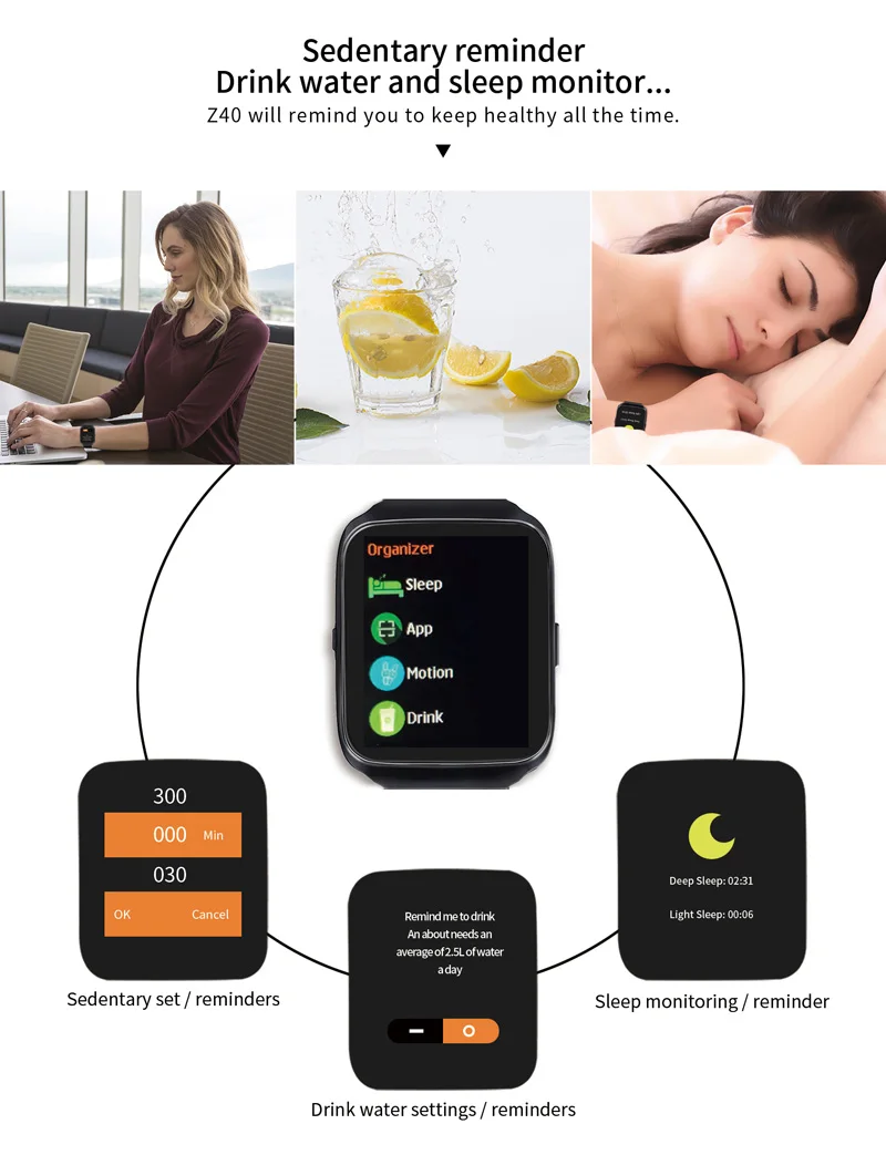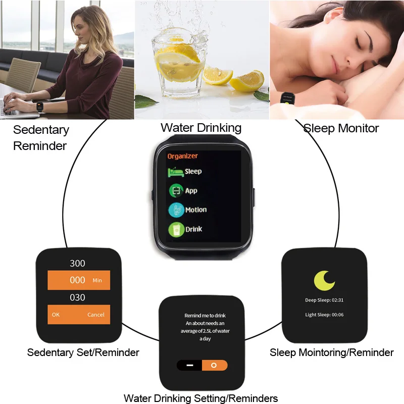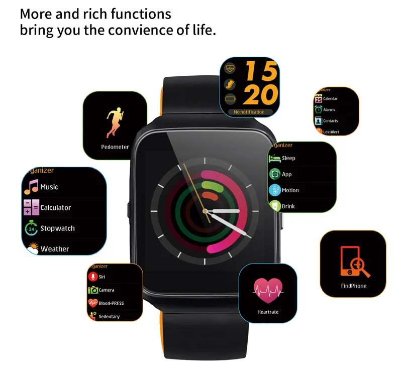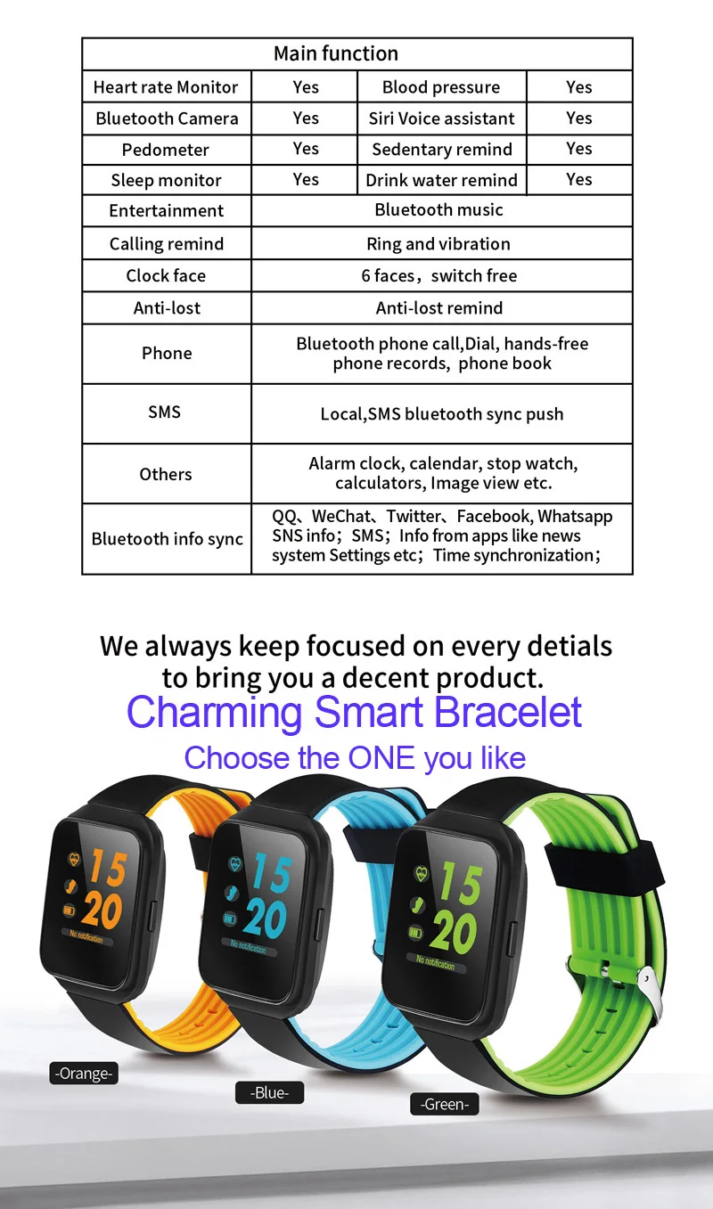 Function:Passometer,Sleep Tracker,Heart Rate Tracker,Calculators,Fitness Tracker,Message Reminder,Calendar,Dial Call,Push Message,Alarm Clock,Remote Control,Answer Call,Call Reminder