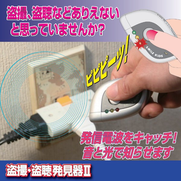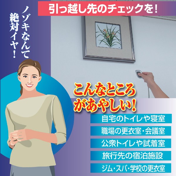 本品は、盗撮器・盗聴器の発信電波をキャッチして、音と光でお知らせします。その場所からの距離範囲に盗撮器・盗聴器が潜んでます。転宅時には特に要注意。出入りの多い家も狙われやすく注意が必要です。