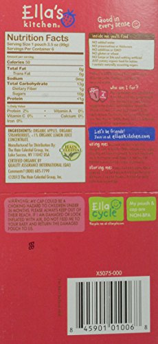 -. Feature : Six 3.5 oz. pouches of Ella's Kitchen 6+ Months Organic Apples + Strawberries Baby Food / Made with apple puree, strawberry puree and a dash of lemon juice concentrate / No artificial preservatives, additives or thickeners / For babies 6 months and older / USDA-Certified Organic / For babies 6 months and older