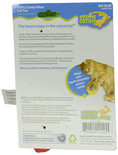-. Binding : Misc. -. Brand : Pet Zone -. Label : Pet Zone -. Manufacturer : Pet Zone -. PackageQuantity : 1 -. ProductGroup : Pet Products -. ProductTypeName : PET_SUPPLIES -. Publisher : Pet Zone -. Studio : Pet Zone -. Title : OurPets 100-Percent Catnip Filled Chili Pepper Cat Toy, Hot Stuff