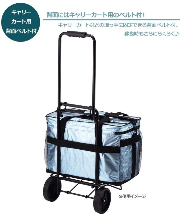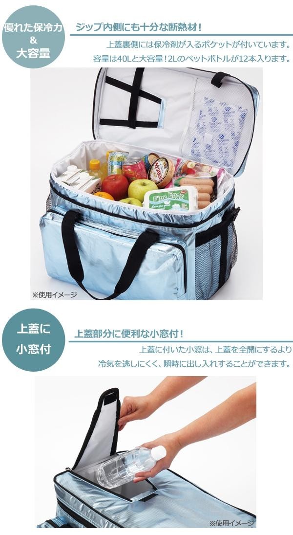 断熱剤1mmで優れた保冷力。冷気を逃がさない小窓付きです。ジップ内側にも十分な断熱材が入っています。大容量の40Lで、2Lのペットボトル12本収納可能!また、未使用時はコンパクトに折りたためるので持ち運びに便利です。キャリーカート用の背面ベルト付き。 |