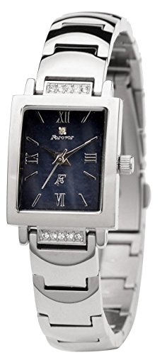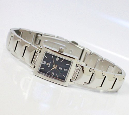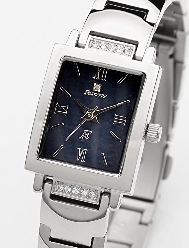 シルエットが美しいスクエアー型の本体で、シェル文字盤の12時位置に天然ダイヤモンドが1ポイントが輝きます。上下にクリスタルを各5個を埋め込んで高級感を演出しています。同じデザインのメンズ時計もございますのでペア時計としてギフトやプレゼントにもオススメします。