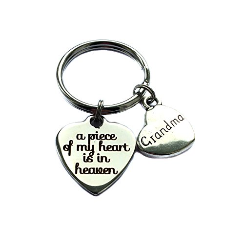 Studio : Heart Projects Publisher : Heart Projects Binding : Jewelry Product Description Keychain, made with a 3/4" x 7/8" or 19mm x 22mm stainless steel "A Piece Of My Heart Is In Heaven" heart charm and an antique silver "Grandma" heart charm. Can be used as a keychain, bag charm, zipper pull, etc. 0