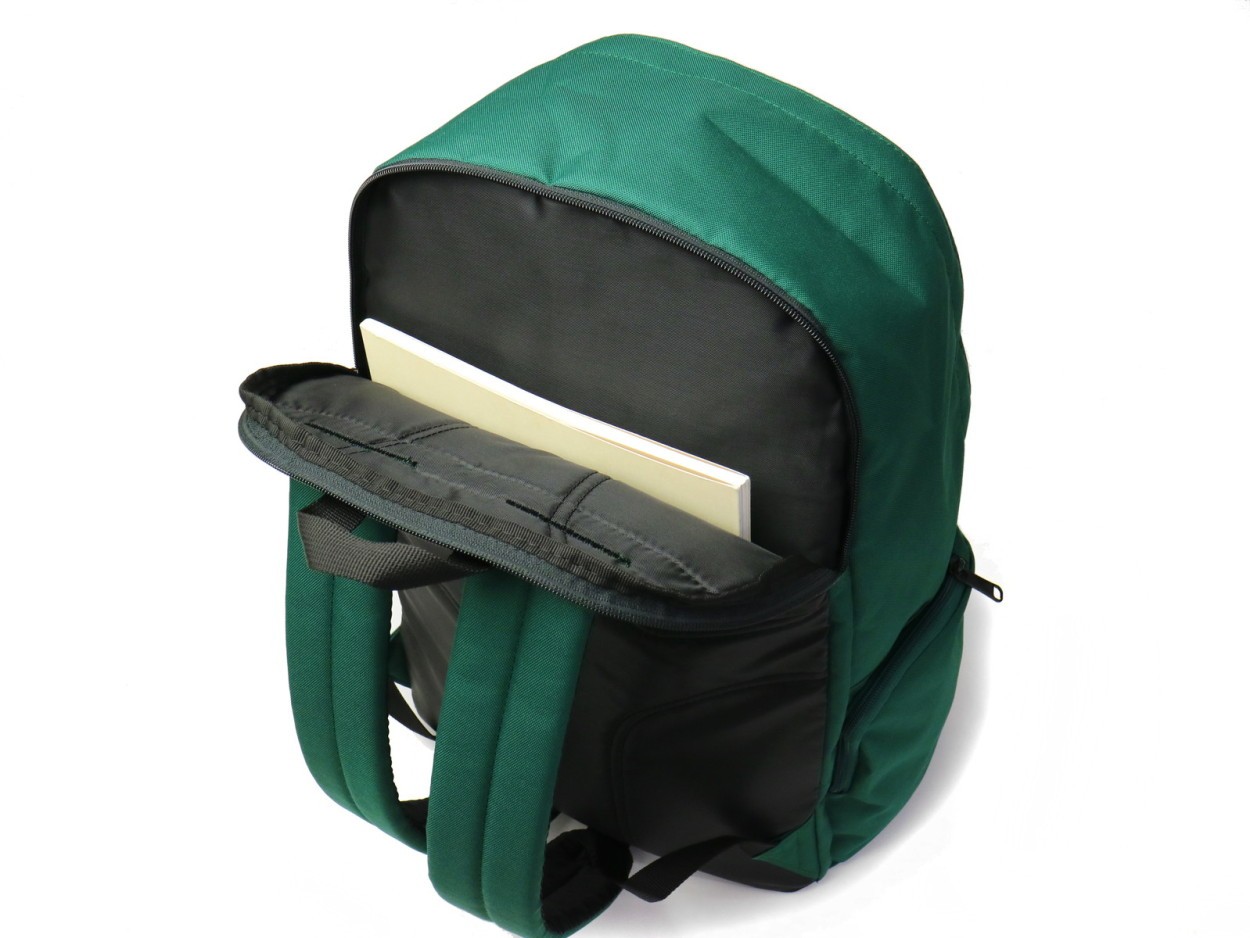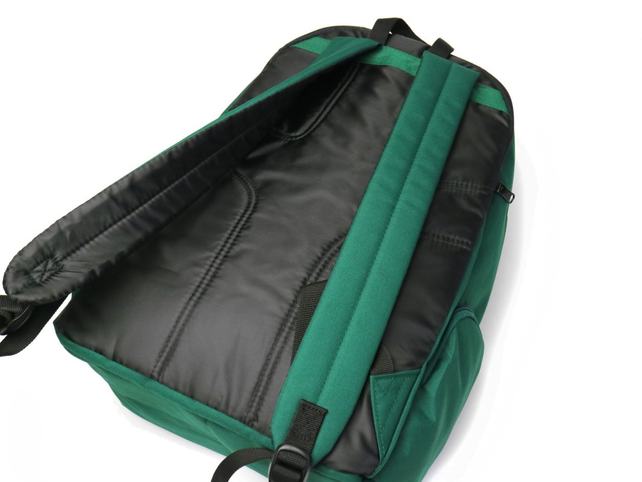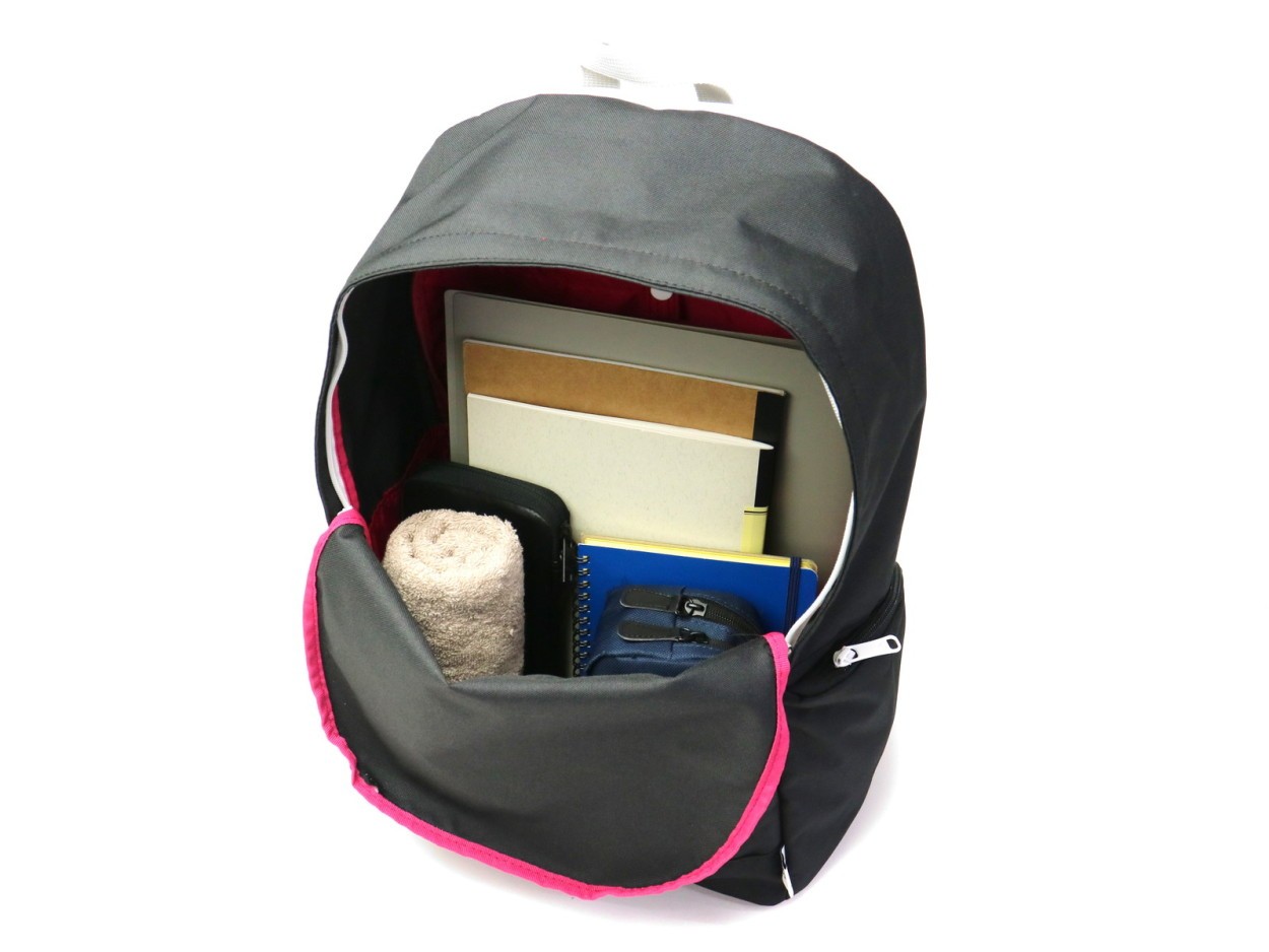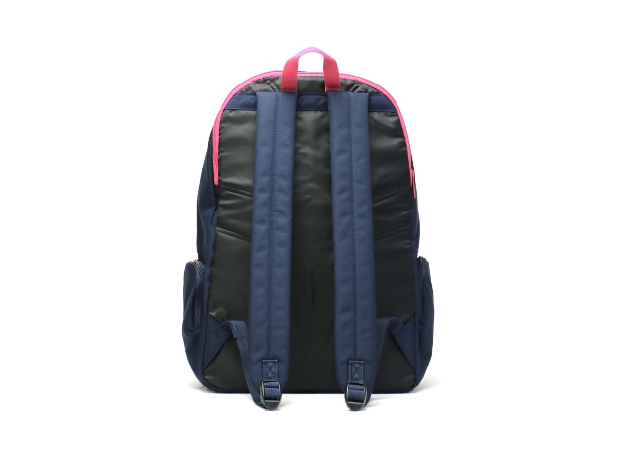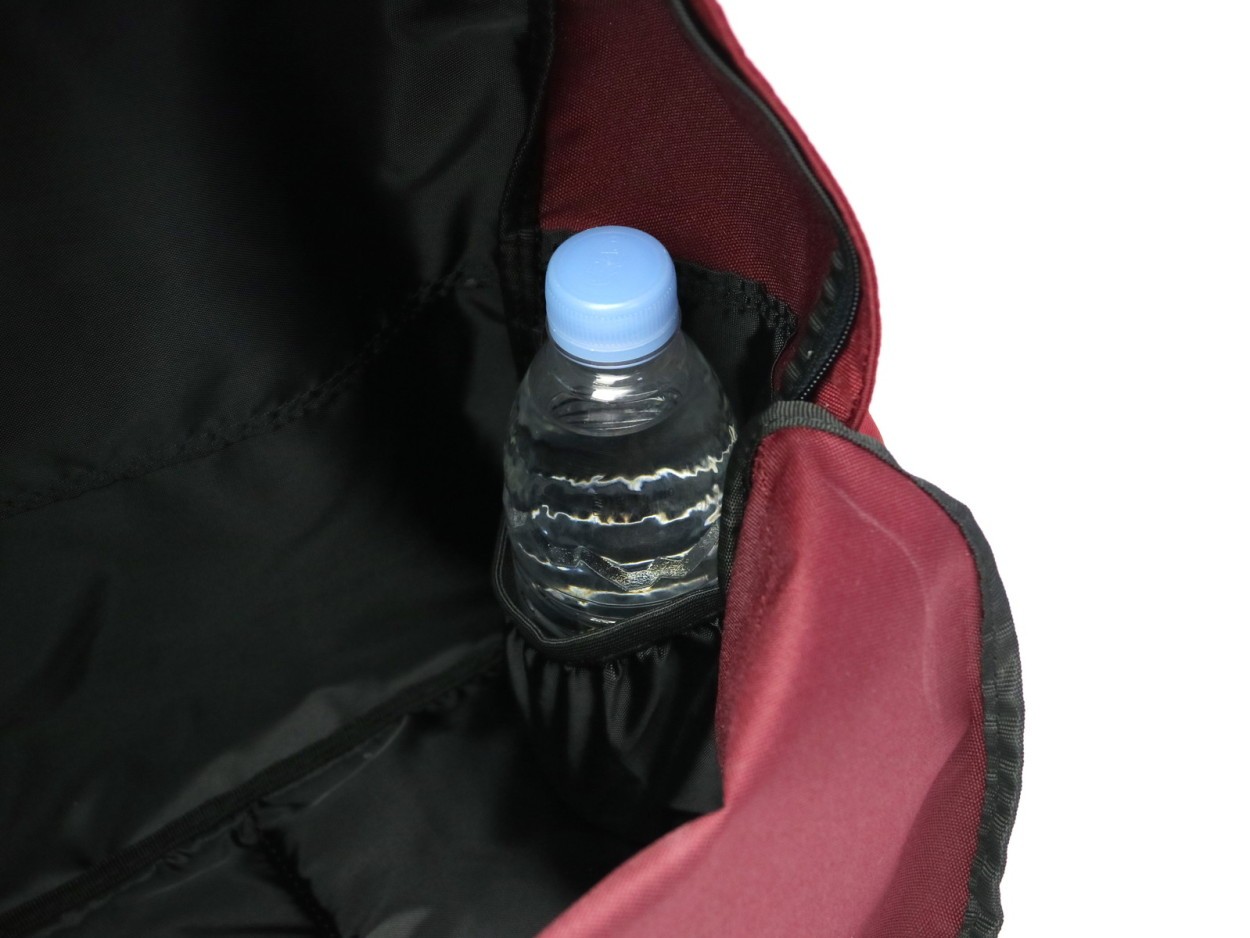 収納スペースはB4サイズに対応し、多めの荷物もしっかりと収納できるサイズ感です。内部、背面側には分けておきたい小物の収納に便利なスナップポケットを装備。サイドには毎日欠かせない水筒やペットボトルを収めておけるポケットを設けています。