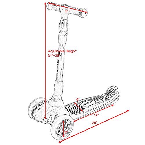 -. Feature : 【Wide and Thick Deck】The wide and thick deck of this Goplus kick scooter will make it safer, more stable and balanced. / 【4 Stable LED Wheels】This scooter includes 4 LED wheels. Two big wheels are in the front while the other two are smaller at rear together. Wheels are high elasticity, wearproof, smooth, silent and will not damage the floor. / 【Safe Brake】It has a brake design at the end of deck, you can easily to use for quick and firm breaking fast. / 【Foldable and Height Adjustable】Height of scooter can be adjusted from 31" to 35". It is portable and foldable which won't take up you much place but easy to take. / 【Customer Service & Guarantee】If there is any questions pls feel free to contact us, our customer service team will response in 24 hours. If there is any part missing or damaged during shipping, please contact us first, we will offer reasonable solutions to meet your satisfaction.