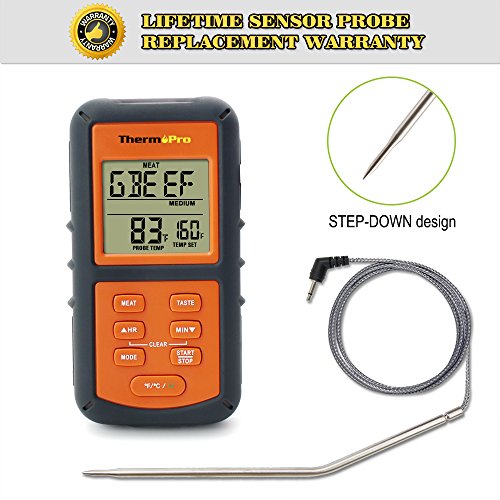 ThermoPro - Cook Like A Pro Every Time! The ThermoPro TP-06 Digital Thermometer is so versatile, accurate and efficient when it comes to assisting with the cooking process. With its broad temperature range and large, smart backlit LCD display that switches color during the cooking process and an alarm that sounds when your meat is cooked to perfection, you'll never under cook or overcook your meat again! Need to time how long that turkey has been in the oven? Don't worry, it includes a timer as well! If you're not an experienced cook, we've got you covered as our unit includes USDA preset temperatures for different meats at different doneness levels.