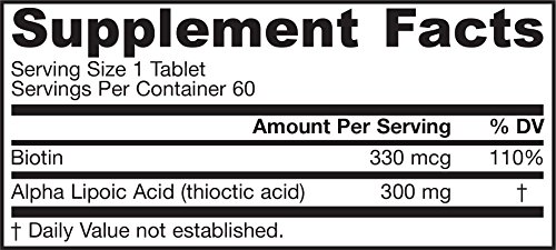 Suggested Use As a dietary supplement take 1 tablet 1 or 2 times per day with meals - Or as directed by your healthcare professional. Supplement FactsServing Size: 1 TabletServings Per Container: 60Amount Per Serving% Daily Value***Biotin333 mcg111%Alpha Lipoic Acid (thioctic acid)300 mg ***Percent Daily Values are based on a 2,000 calorie diet