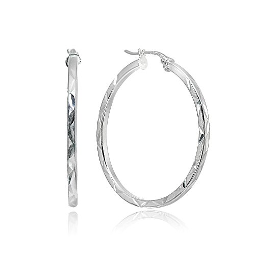 High polished earrings display square-tube diamond cut round hoops with click-top closures. Choose the diameter size that suits you style. The hoops are crafted of sterling silver and are nickel free.