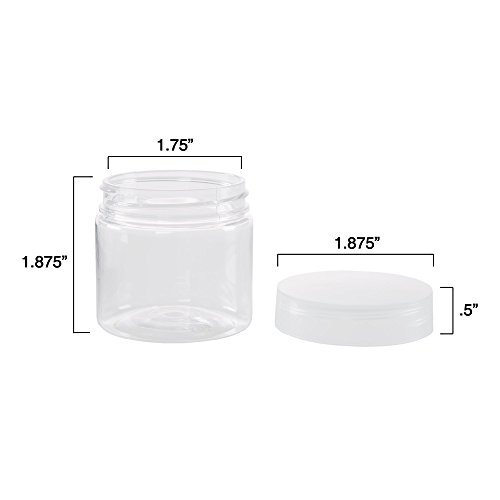 - PRODUCT DETAILS – Dimensions: Lid width 1.875 inches, lid height .5 inches, jar height 1.875 inches, jar opening width 1.75 inches. Made of PET plastic material. Contains 6 jars- 2 ounces each.