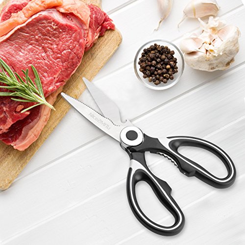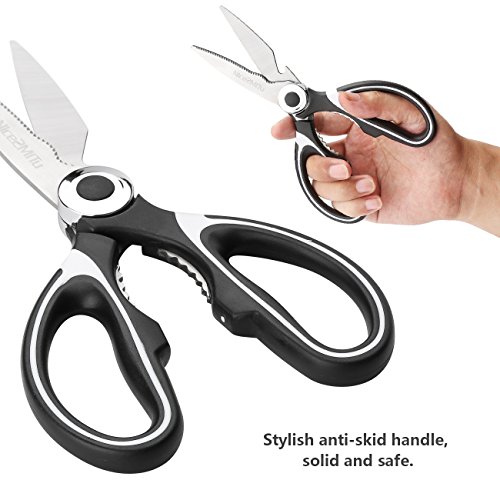 - · ✄ COMFORTABLE AND SAFE: Our kitchen shears ensure non-slip cutting in various tasks, saving effort while avoiding accidental injury whenever you using. The environmentally friendly material handle, stylish and anti-skid, makes you feel completely comfortable. Stainless steel embedded in the handle deeply, makes it be solid and safe. These comfortable and super sharp scissors will make food preparation easier and faster.