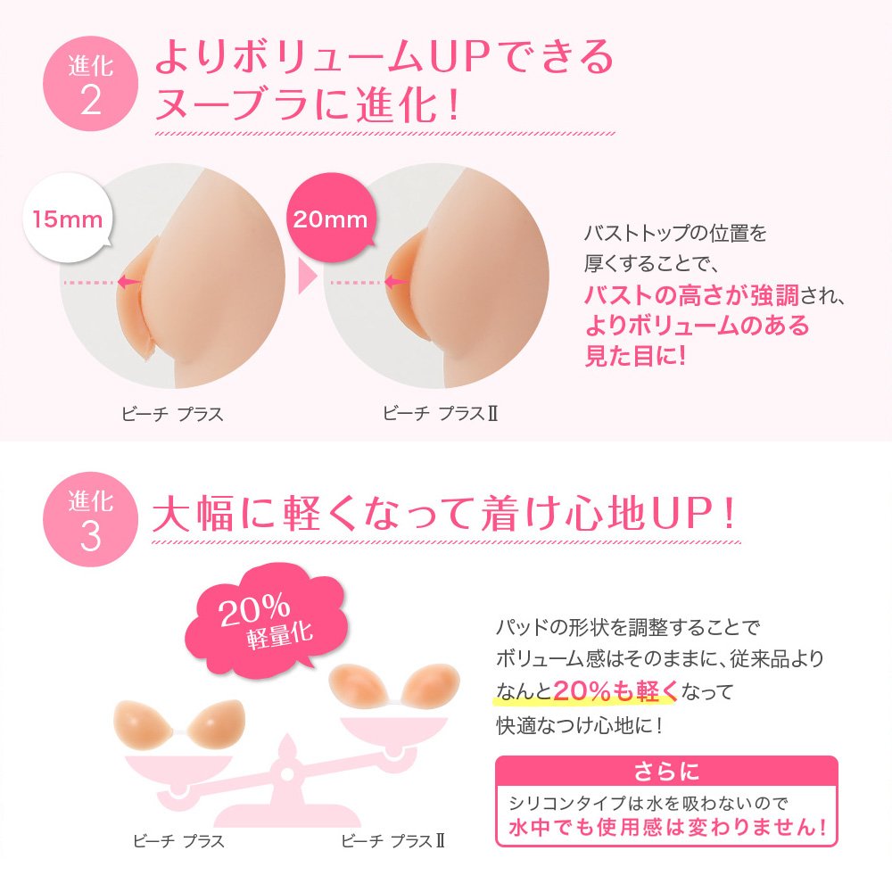 - From the trend swimsuit to the triangle bikini etc, "Nubura · Beach Plus II" which can cope with any swimwear can respond to a wide range of needs from people of Petit Bust to those seeking a realistic texture like real chest