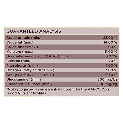 素材構成:粗タンパク質 25.0%以上、粗脂肪 14.0%以上、粗繊維 5.0%以下、水分 11.0%以下、DHA 0.07%以下、オメガ6脂肪酸 3.0%以下、オメガ3脂肪酸 0.3%以上、コンドロイチン 80mg/kg以上、グルコサミン 800mg/kg以上