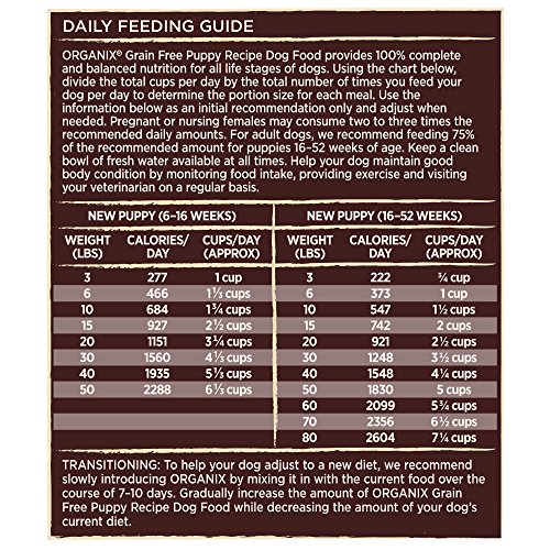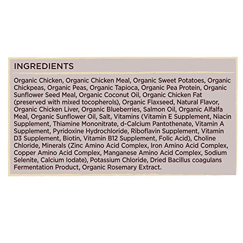 原材料:有機チキンミール、有機サツマイモ、有機ヒヨコマメ、有機エンドウマメ、有機タピオカ、有機エンドウマメプロテイン、有機ヒマワリ種子ミール、有機ココナッツオイル、有機鶏脂肪(ミックストコフェロールにて酸化防止済み)、有機亜麻仁、ナチュラルチキンフレーバー、有機鶏肝臓、有機ブルーベリー、サーモンオイル、有機アルファルファミール、有機ヒマワリ油、塩、ビタミン(ビタミンEサプリメント、ナイアシンサプリメント、硝酸チアミン、パントテン酸Dカルシウム、ビタミンAサプリメント、塩酸ピリドキシン、リボフラビンサプリメント、ビタミンB3サプリメント、ビオチン、ビタミンB12サプリメント、葉酸)、塩化コリン、ミネラル(亜鉛タンパク質化合物、鉄タンパク質化合物、銅タンパク質化合物、マンガンタンパク質化合物、亜セレン酸ナトリウム、ヨウ素酸カルシウム)、塩化カリウム、有胞子性乳酸菌乾燥発酵品、有機ローズマリー抽出物